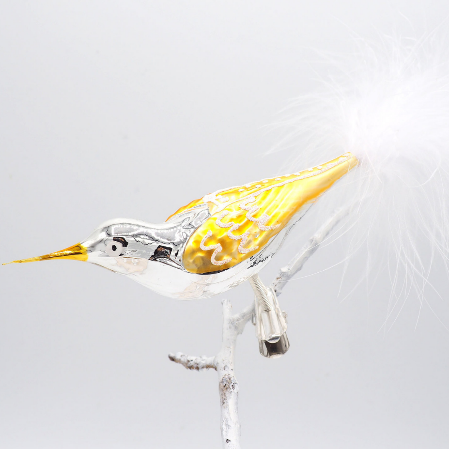 Hochwertige Weihnachtsdekoration aus Glas. Der ansteckbare, elegante Vogel ist ein wahres Highlight für den Christbaum oder die Weihnachtsdekoration. Mit echten Federn verziert, zieht er alle Blicke auf sich.